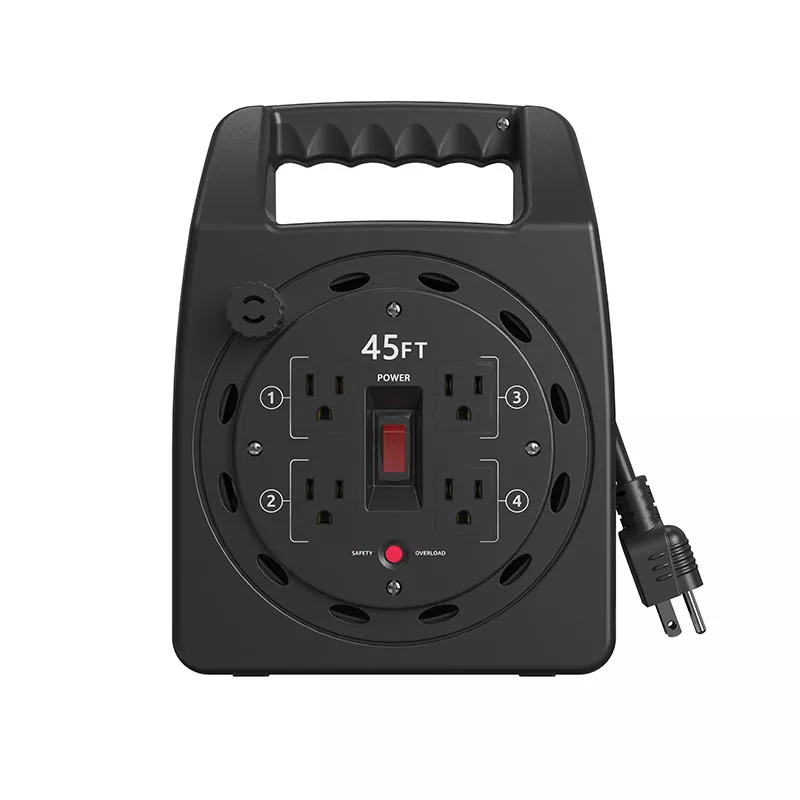 Večnamenski plastični kolut za kabel s 4 vtičnicami dolžine 45 ft z zaščito pred preobremenitvijo se lahko uporablja na prizorišču, vključno s spalnico, dnevno sobo in kuhinjo.